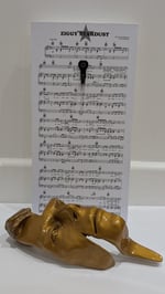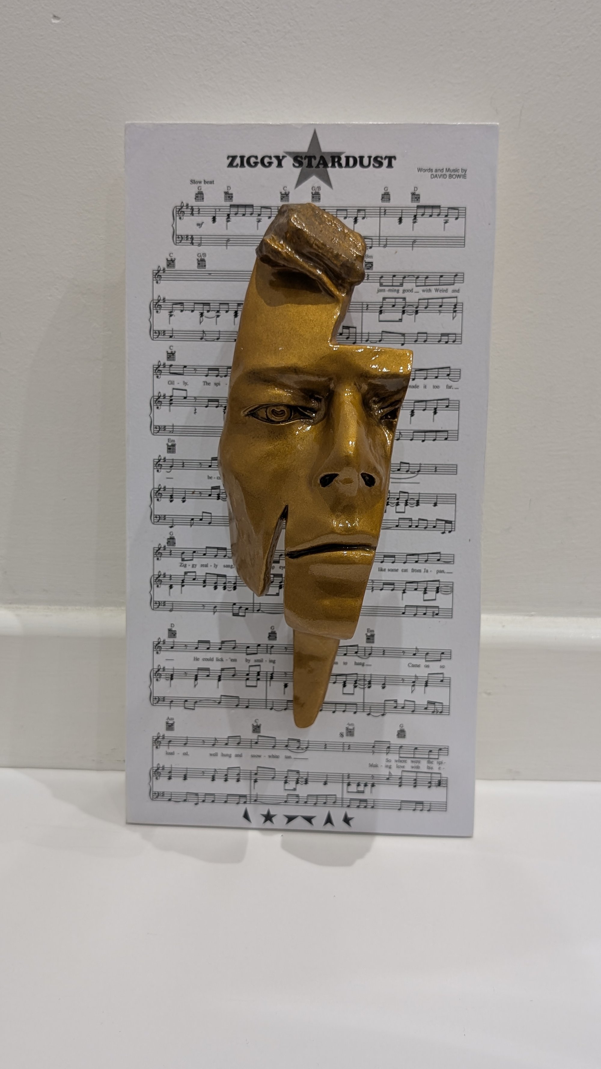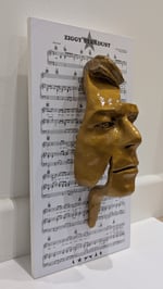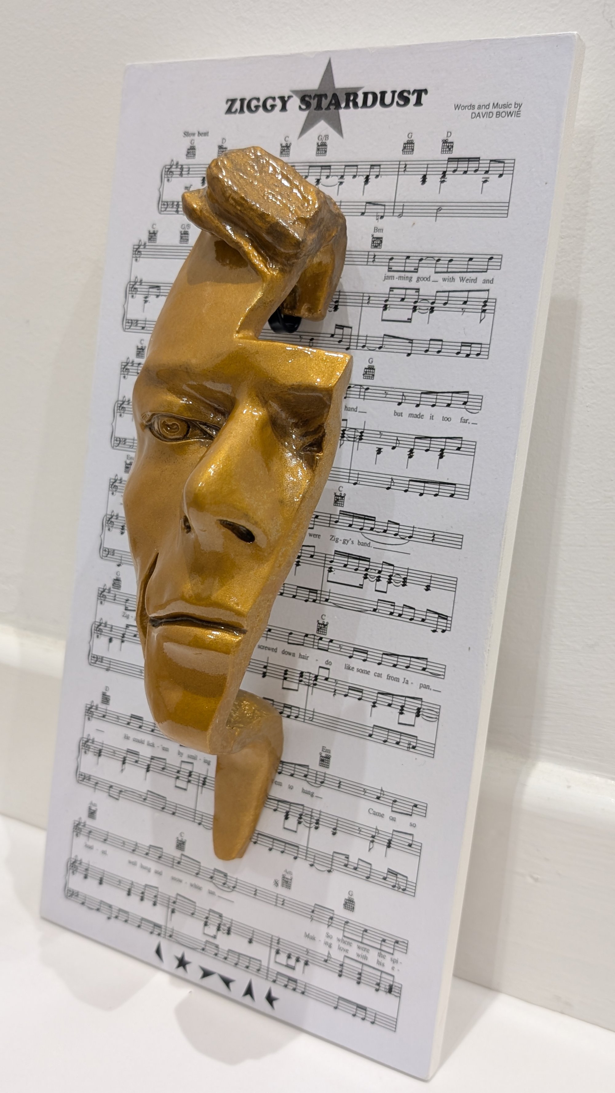 The resin sculpture is displayed on a Ziggy Stardust music sheet themed wooden panel which can be hung on a wall.